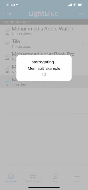 Now that we verified that we can discover our device (“Memfault_Example”), we can attempt to connect to it. Simply click on the device and it should initiate a connection. You should momentarily see a message similar to the following before it establishes the connection: