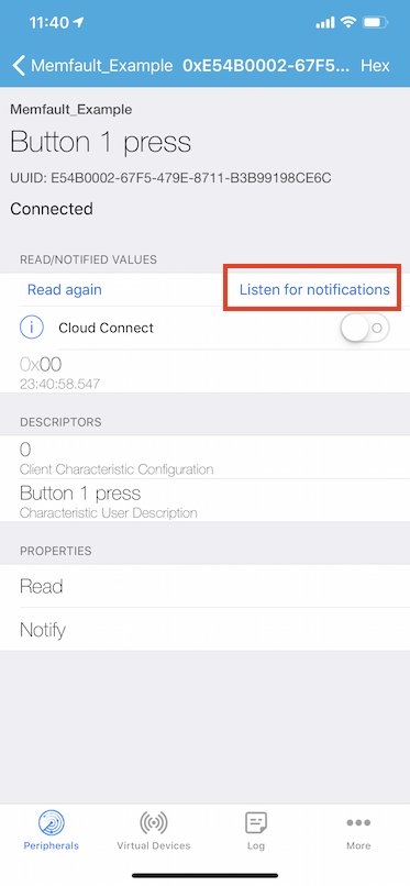 Finally, let’s verify that we can get notified when the Button 1 state changes. We can do so by clicking on the “Listen for notifications” button.