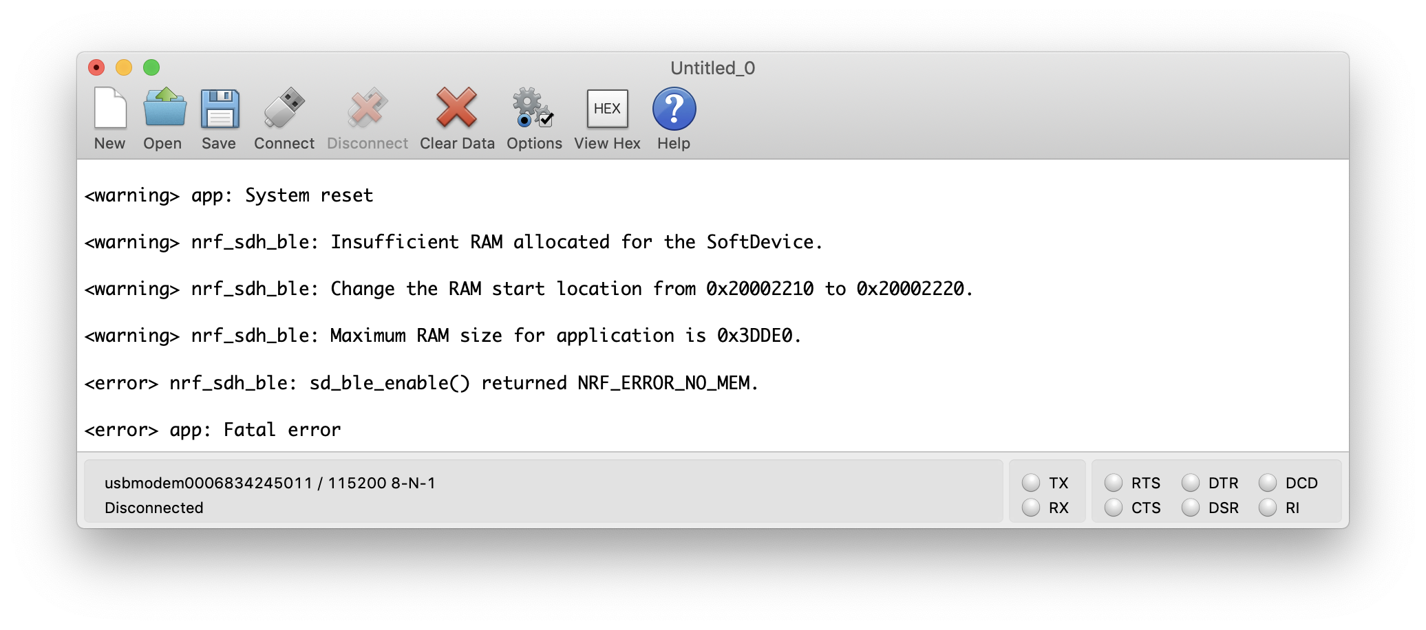 This is due to the fact that we modified the value of the macro for the number of vendor-specific UUIDs in the SoftDevice. The good part is that the log output tells us exactly which values we need to use for RAM offset and RAM size to fix this problem.