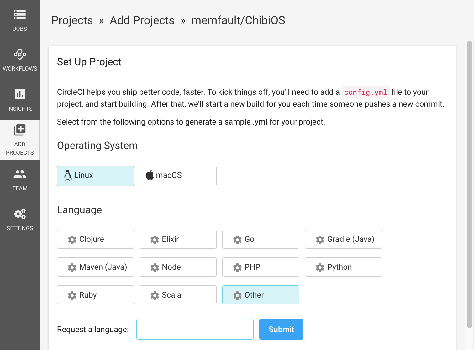 Click “Set Up Project” and follow the instructions. ChibiOS is a C project with robust tooling to build it on Linux, so we recommend you select “Linux” as the operating system, and “Other” as the language.