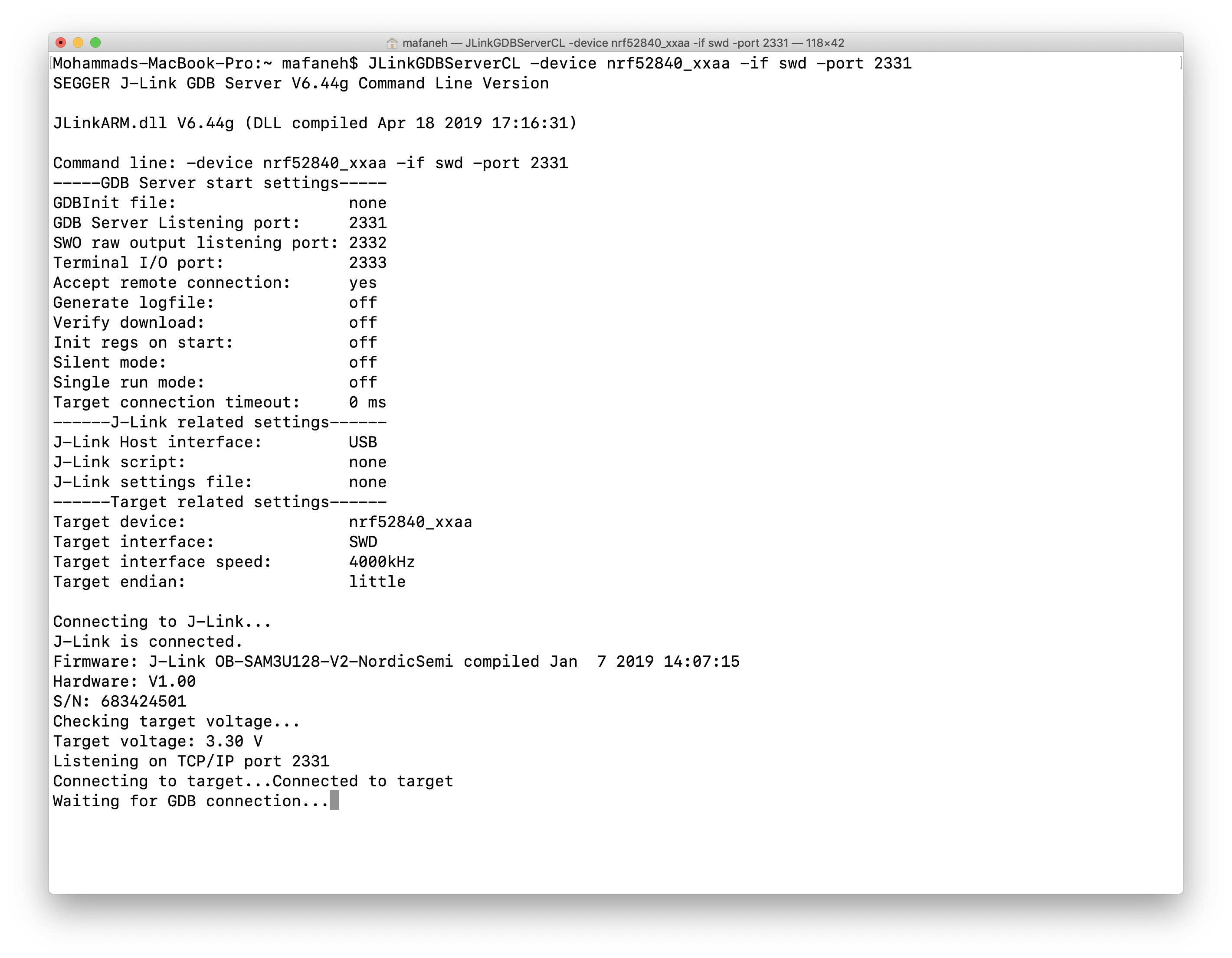 $ JLinkGDBServerCL -device nrf52840_xxaa -if swd -port 2331- “-device” specifies the device type (“nrf52840_xxaa” in our case).