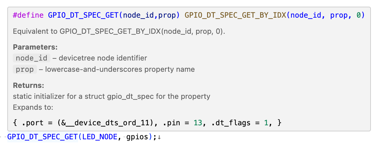 Let’s ignore the gpio_dt_spec structure’s contents for now. Instead, let’s see how GPIO_DT_SPEC_GET is used to populate the structure and how it compares with what we’ve learned about the Devicetree API in the previous articles: