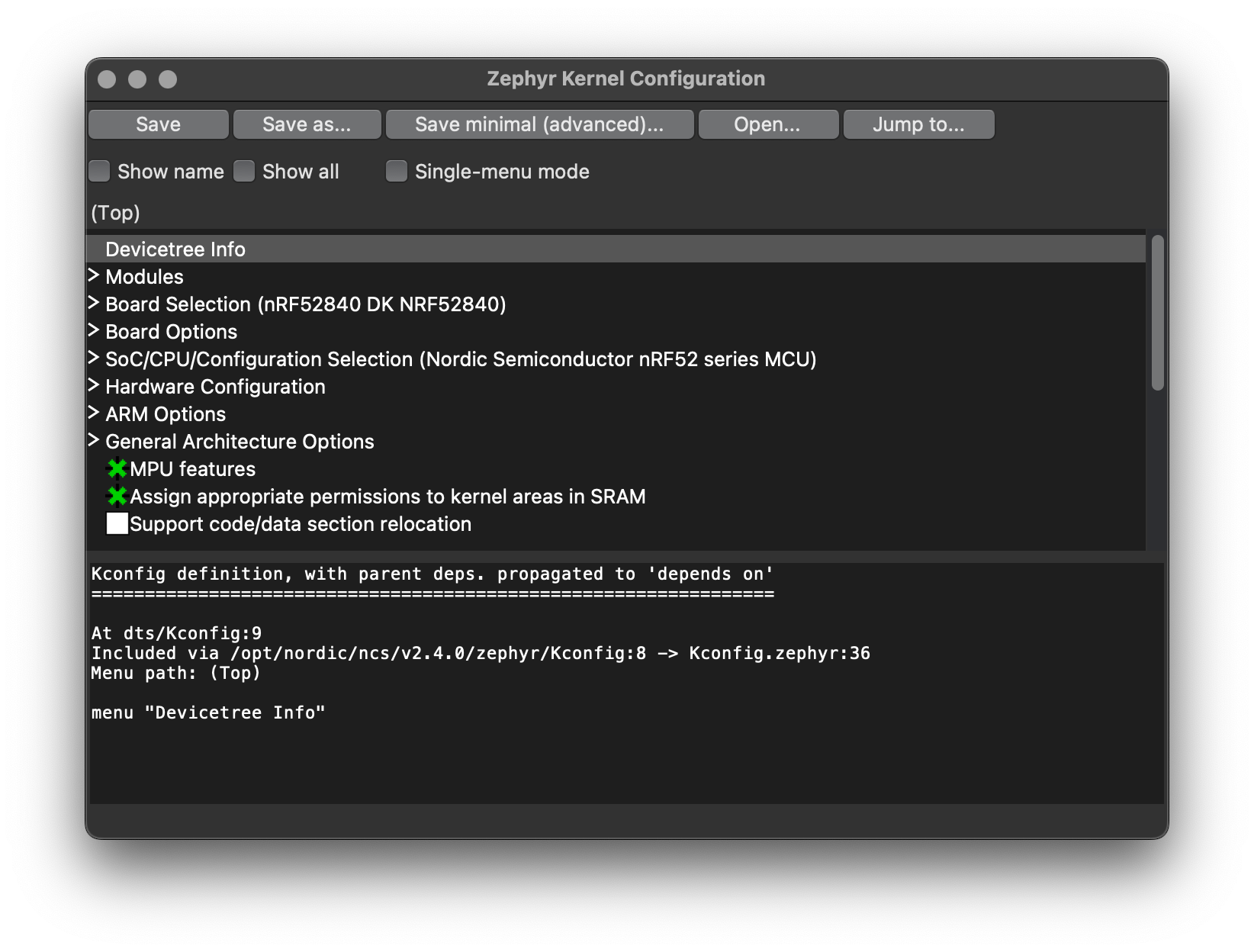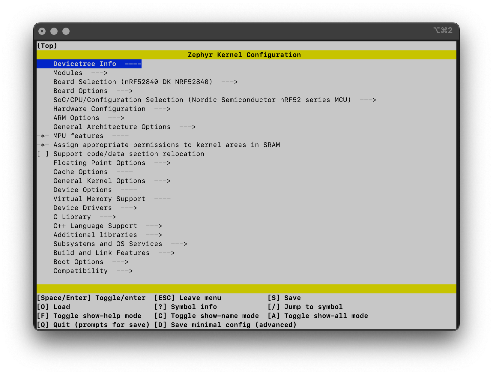 Zephyr contains hundreds of so-called Kconfig fragments. It is therefore almost impossible to navigate these files without tool support. Thankfully, West integrates two graphical tools to explore available Kconfig options and their current setting: menuconfig and guiconfig.