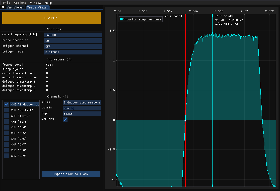 Trace Viewer is a module that reads and parses SWO (Serial Wire Viewer) data using an ST-Link. You need to connect SWDIO, SWCLK, SWO, and GND to use it. This tool operates synchronously, meaning it visualizes data points at the rate they are produced on the target. A data point can be either a special single-byte flag used to create digital plots or any value that fits within up to 4 bytes, as in the case of ‘analog’ plots. It incurs minimal performance overhead, involving just a single register write per plot point, as the ITM peripheral handles serialization and timestamping. Trace Viewer can be employed for profiling specific parts of the codebase or visualizing signals that are too fast for the asynchronous Variable Viewer. Its main limitations are the maximum allowed SWO pin baud rate of the ST-Link and that the ITM peripheral is supported only on Cortex M3/M4/M7/M33 cores.
