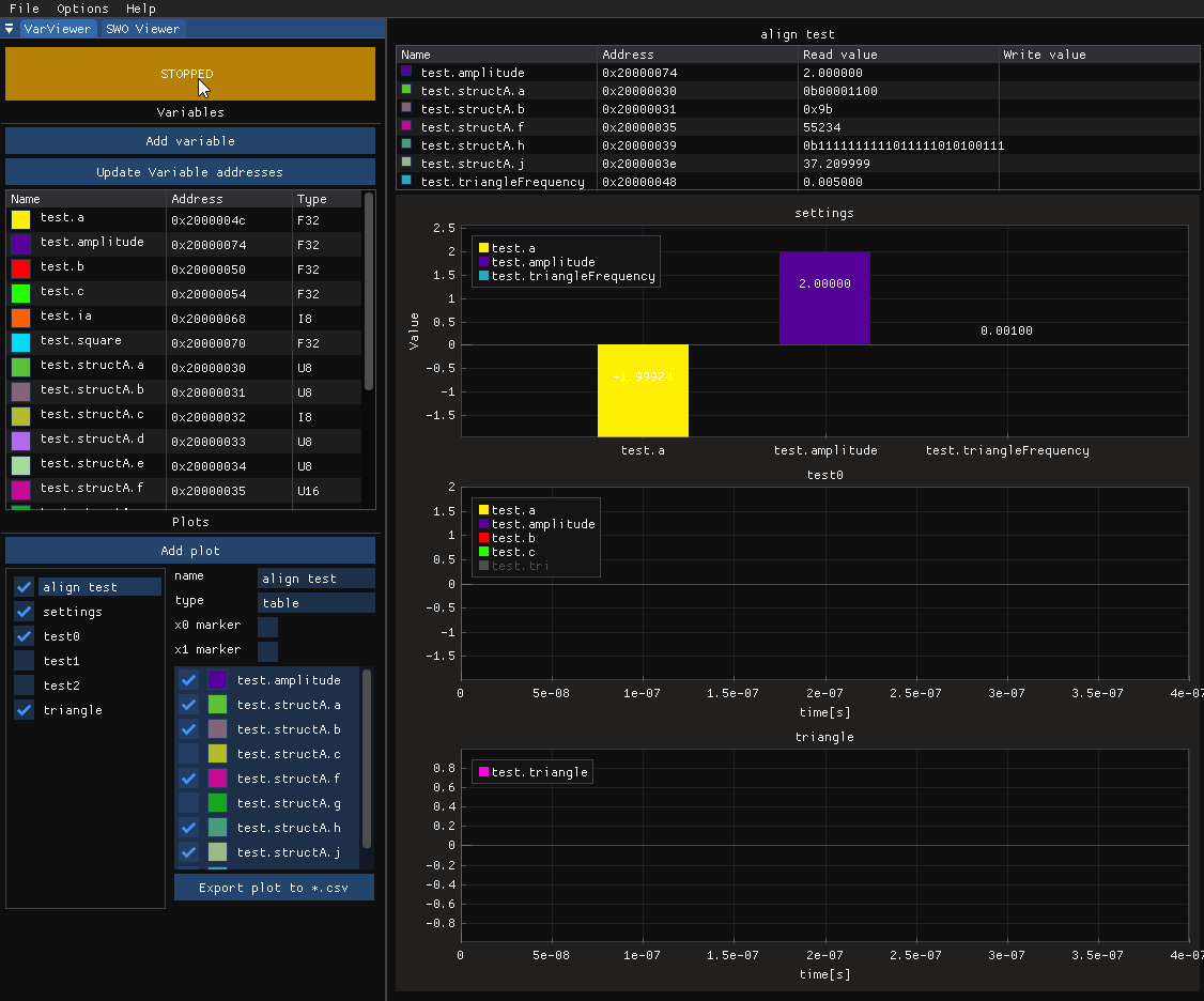 Variable Viewer is a module that reads variables’ values directly from RAM using ST-Link SWD (only SWDIO, SWCLK, and GND connection is needed). It is asynchronous, which means it samples the memory with the period set on the PC. It is entirely non-intrusive and can log many variables at once. Writing is supported as well. There are some trade-offs, though. The first one is that logged variables’ addresses must be constant, meaning they must be globals. Moreover, with more aggressive optimization, some variables may get optimized and fail to be logged.